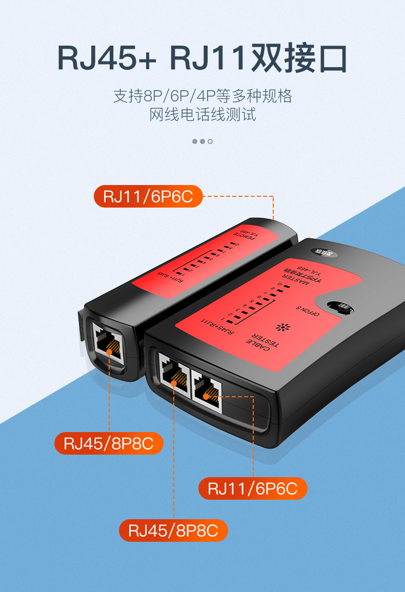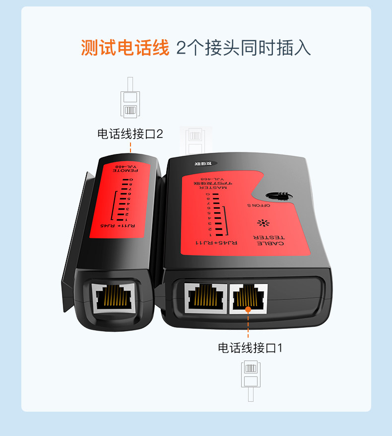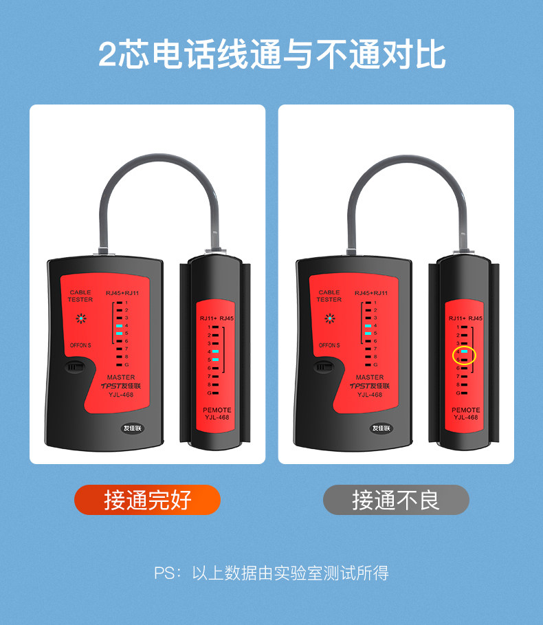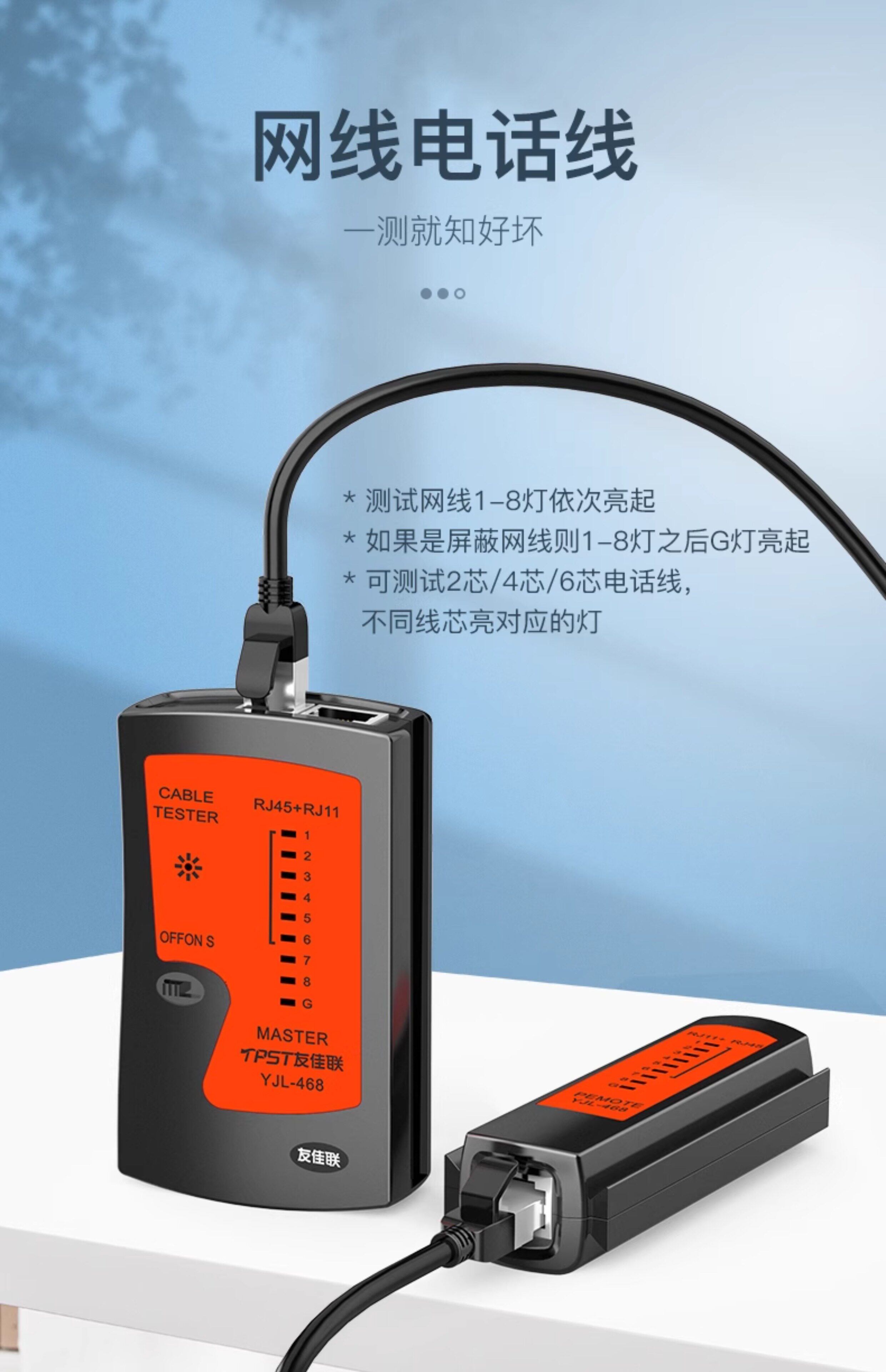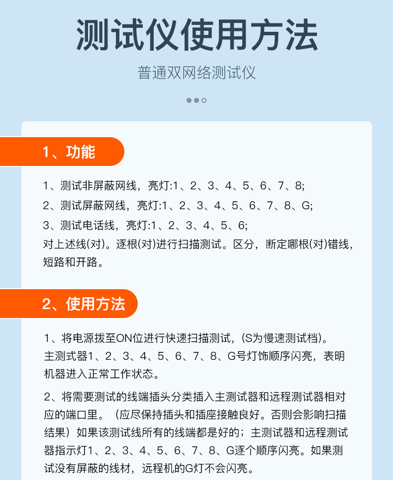 1、测试非屏蔽网线,亮灯:1、2、3、4、6、6、7、8;2、测试屏蔽网线,亮灯:1、2、3、4、5、6、7、8、G;