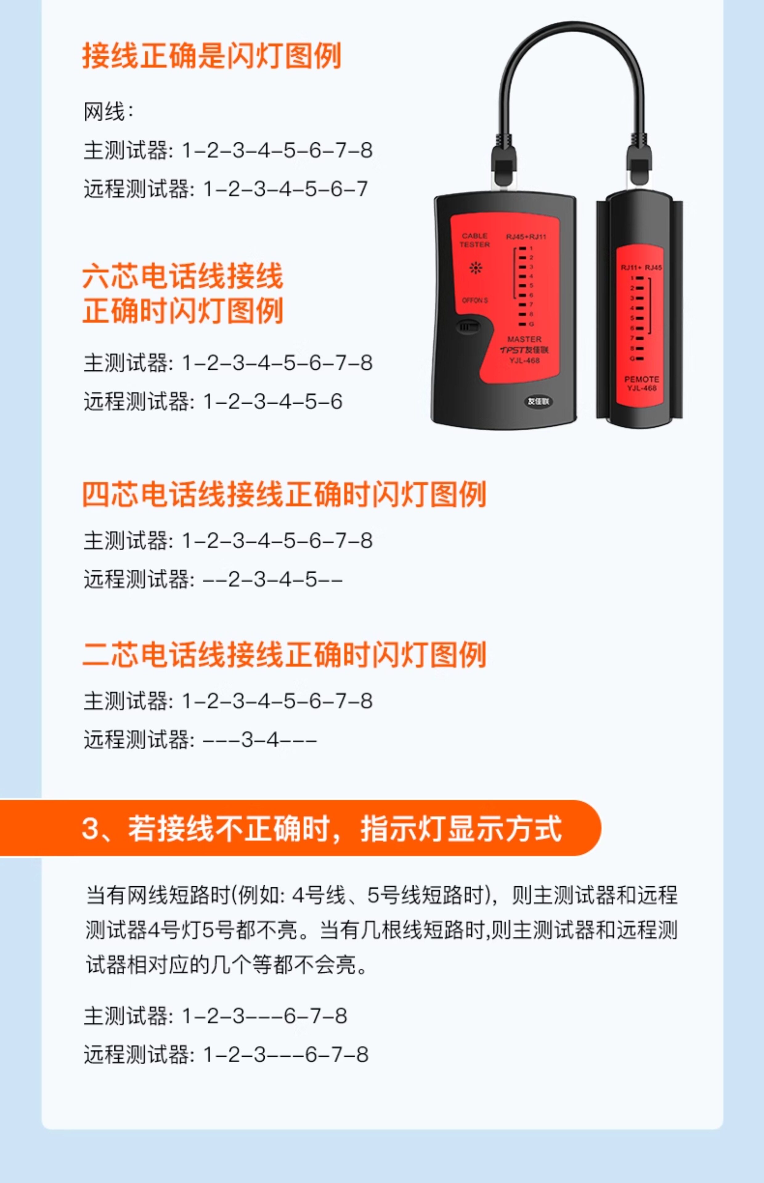 二芯电话线接线正确时闪灯图例主测试器:1-2-3-4-5-6-7-B