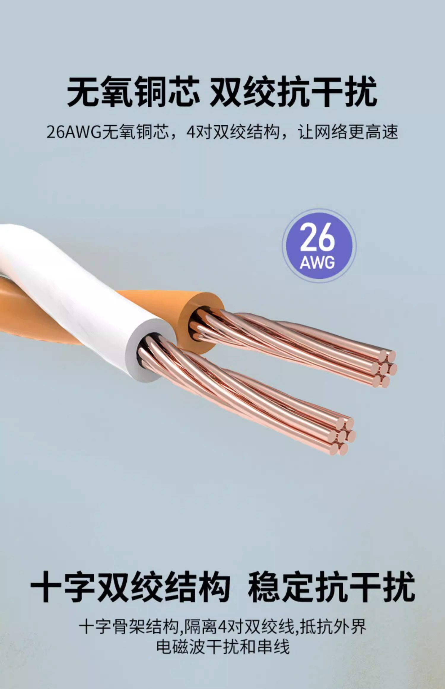 26AWG无氧铜芯,4对双绞结构,让网络更高速